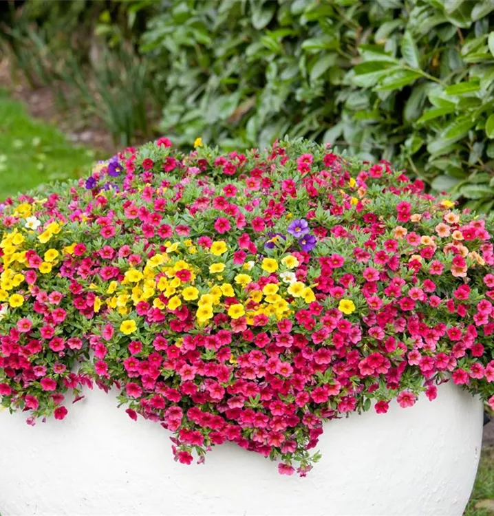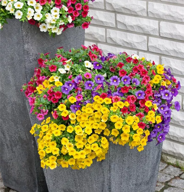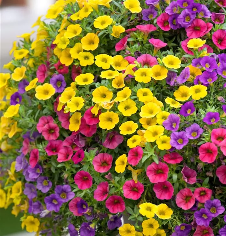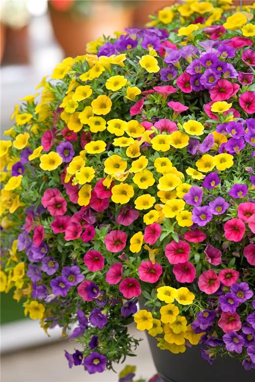 Das Zauberglöckchen 'Celebration<sup>®</sup> Karneval' (Calibrachoa) ist eine beliebte Pflanze für den Balkon. Die unzähligen Blüten erscheinen, je nach Sorte, in verschiedenen Farben die ganze Saison hindurch. Ein halbschattiger Standort und ein durchlässiges Substrat werden bevorzugt.