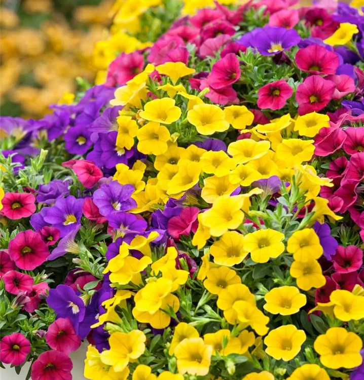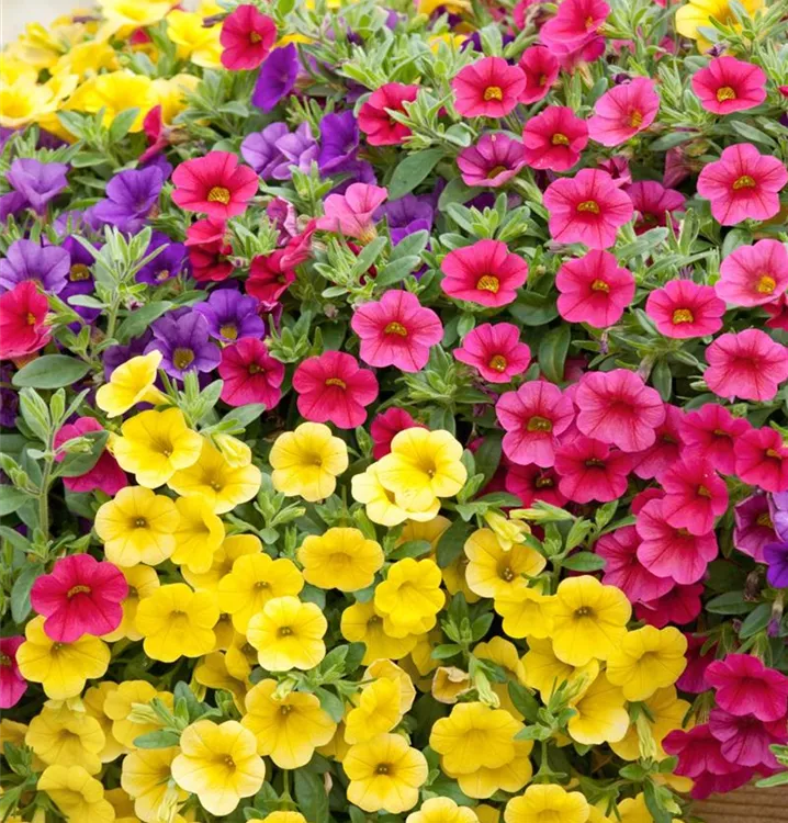 Calibrachoa 'Celebration® Karneval' bildet während der gesamten Saison zahlreiche trichterförmige, gelbe, violette, pinke Blüten.