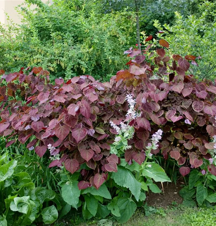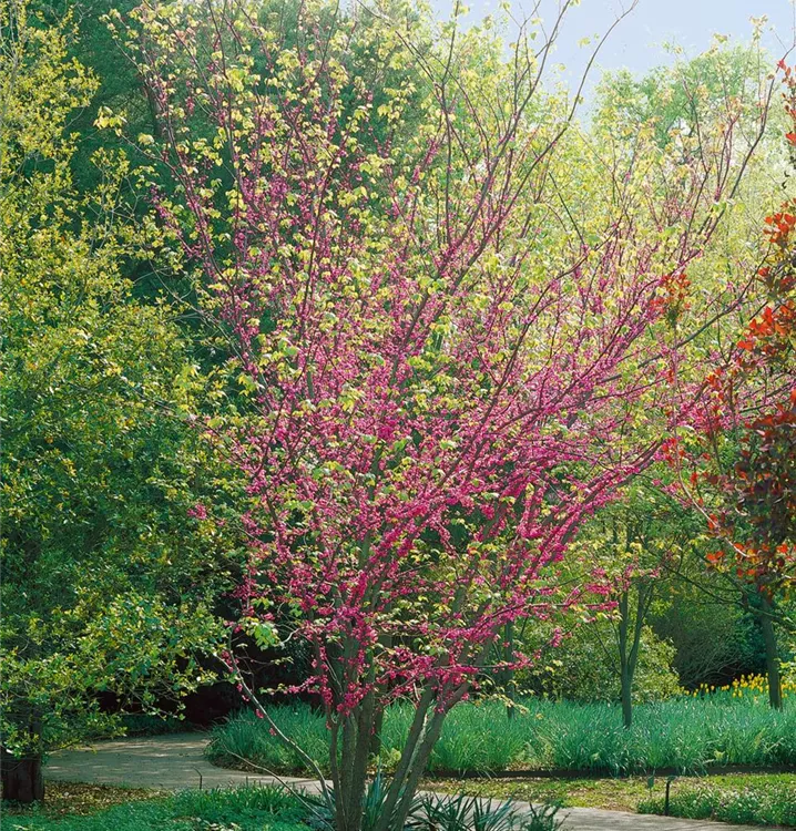 Der Kanadische Judasbaum (Cercis canadensis) ein ausladender, malerischer Großstrauch, der, je nach Sorte, schmetterlingsförmige Blüten in verschiedenen Farben hervorbringt. An einem sonnigen Standort mit durchlässigem, kalkhaltigem Boden erreicht er gewöhnlich eine Höhe von ca. 10 m und wird ca. 8 m breit.