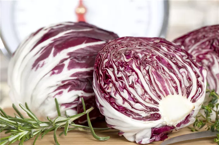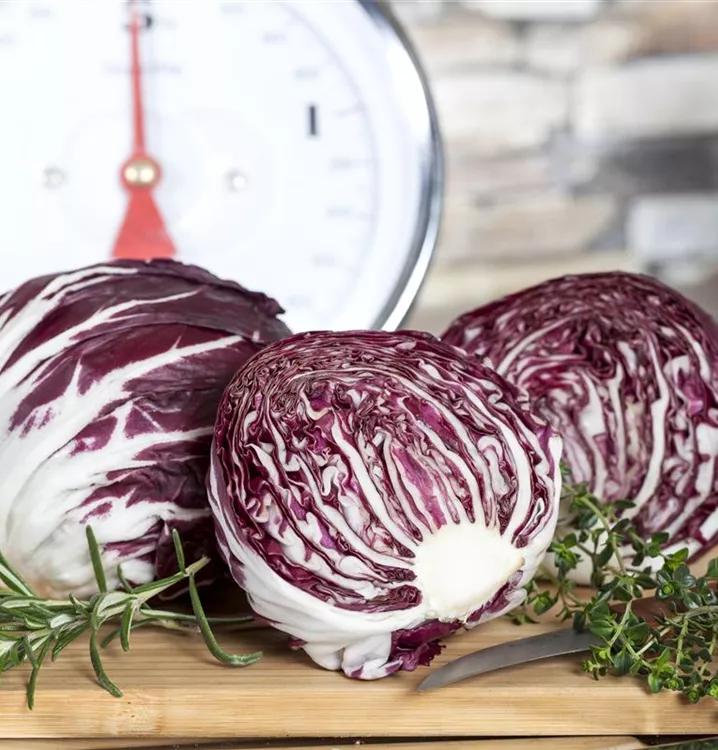 Zum Verzehr geeignet. Die grün-weißen, rot-weißen Blätter überzeugen mit bitterem Geschmack.