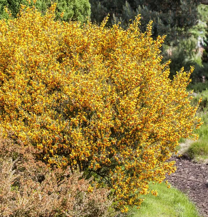Der Besenginster (Cytisus scoparius) ein aufrechter, verzweigter Strauch, der, je nach Sorte, schmetterlingsförmige Blüten in verschiedenen Farben hervorbringt. An einem sonnigen Standort mit humosem, sandigem, saurem Boden erreicht er gewöhnlich eine Höhe von ca. 2 m und wird ca. 2 m breit.