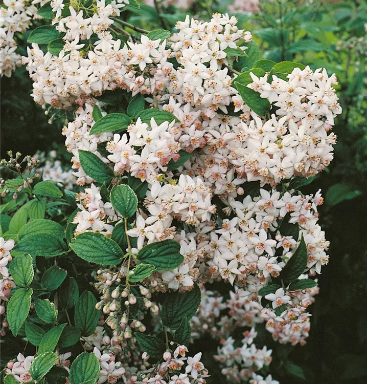 Der Maiblumenstrauch (Deutzia gracilis) ein buschiger, aufrechter, dichter Kleinstrauch, der, je nach Sorte, glockenförmige Blüten in verschiedenen Farben hervorbringt. An einem sonnigen Standort mit durchlässigem, nährstoffreichem Boden erreicht er gewöhnlich eine Höhe von ca. 80 cm und wird ca. 1 m breit.