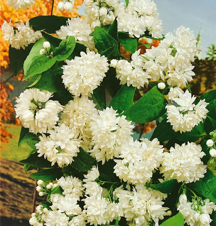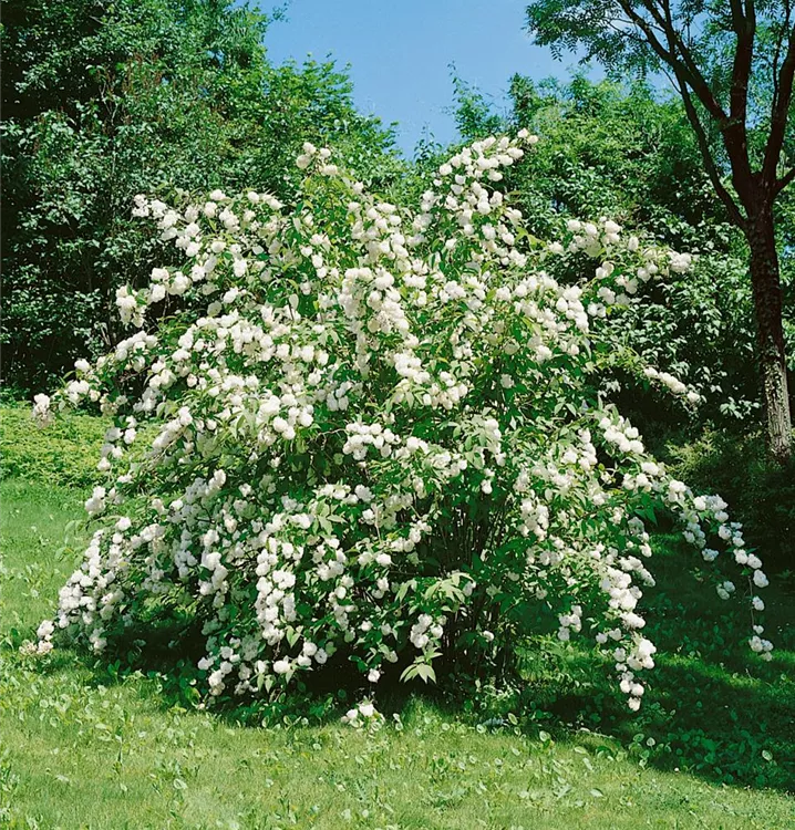 Die weißen, gefüllten, glockenförmigen Blüten des Hohen Sternchenstrauch erscheinen in Rispen im Juni. Diese werden etwa 2 - 3 cm groß.