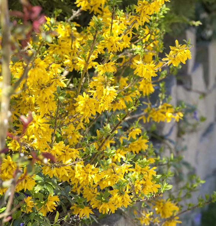 Die Forsythie (Forsythia x intermedia) ein breiter Strauch, der, je nach Sorte, Blüten in verschiedenen Farben hervorbringt. An einem sonnigen bis halbschattigen Standort mit durchlässigem, nährstoffreichem Boden erreicht sie gewöhnlich eine Höhe von ca. 3,5 m und wird ca. 3 m breit.