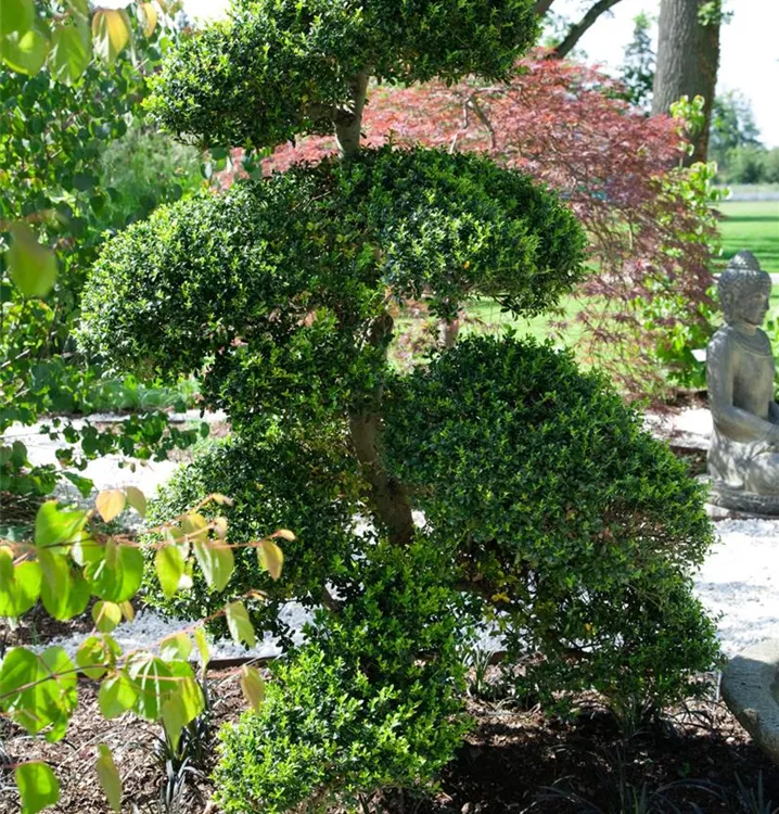 Die Japan-Stechpalme (Ilex crenata) ist ein aufrechter Strauch mit dekorativen, schwarzen Früchten, die sehr lange haften. Die Blüten erscheinen je nach Sorte in verschiedenen Farben.