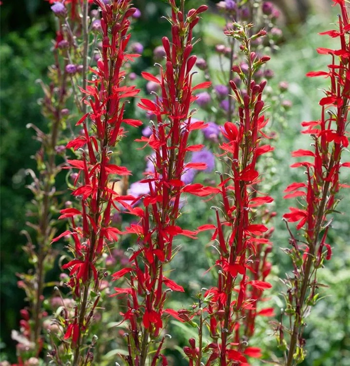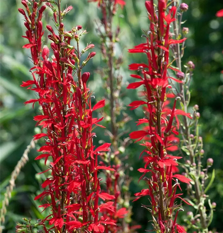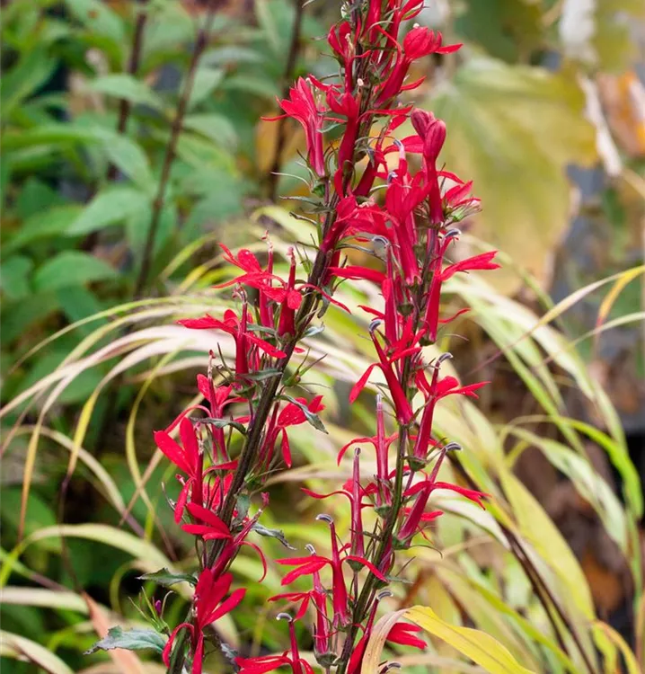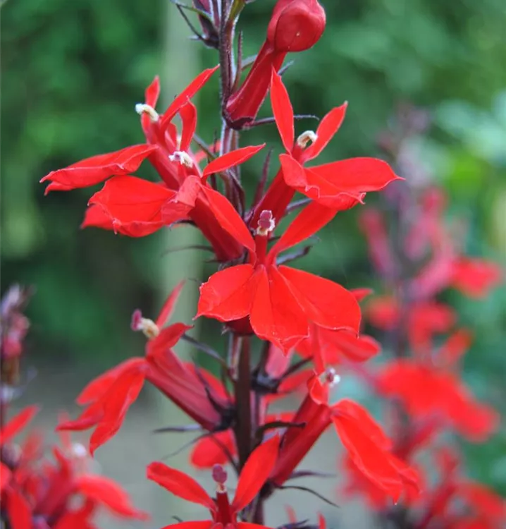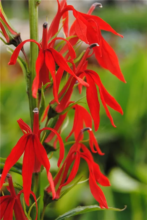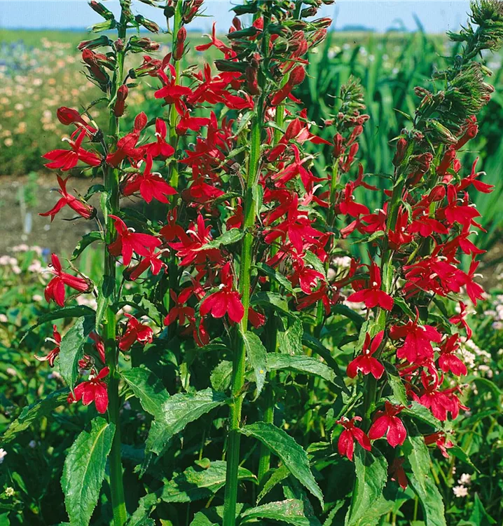 Die Leuchtende Lobelie (Lobelia cardinalis) ist eine aufrechte, horstbildende Staude, die von Juli bis September rote, in Rispen angeordnete Blüten bildet. An einem sonnigen Standort mit humosem, kalkfreiem Boden erreicht sie gewöhnlich eine Höhe von ca. 1 m und wird ca. 60 cm breit. Die Leuchtende Lobelie ist gut frostverträglich.