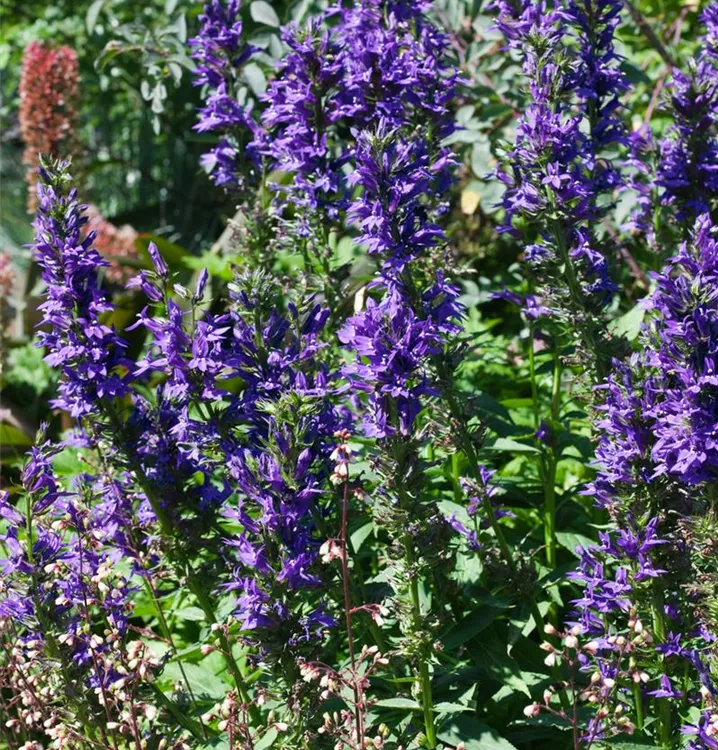 Lobelia x speciosa, blau bildet rote, purpurrote, violette, blaue Blüten ab August.