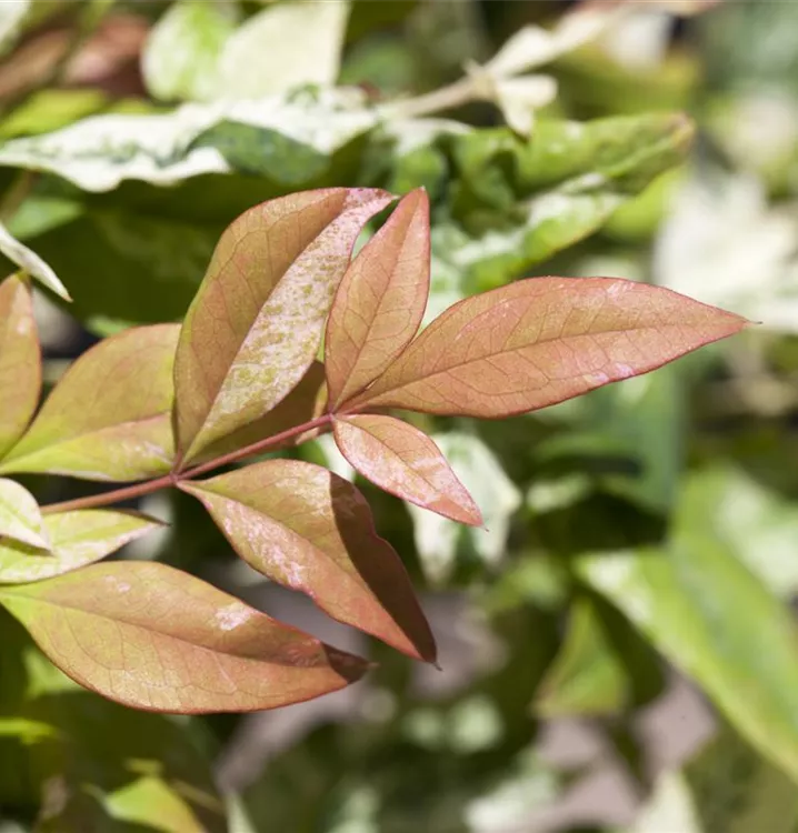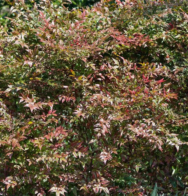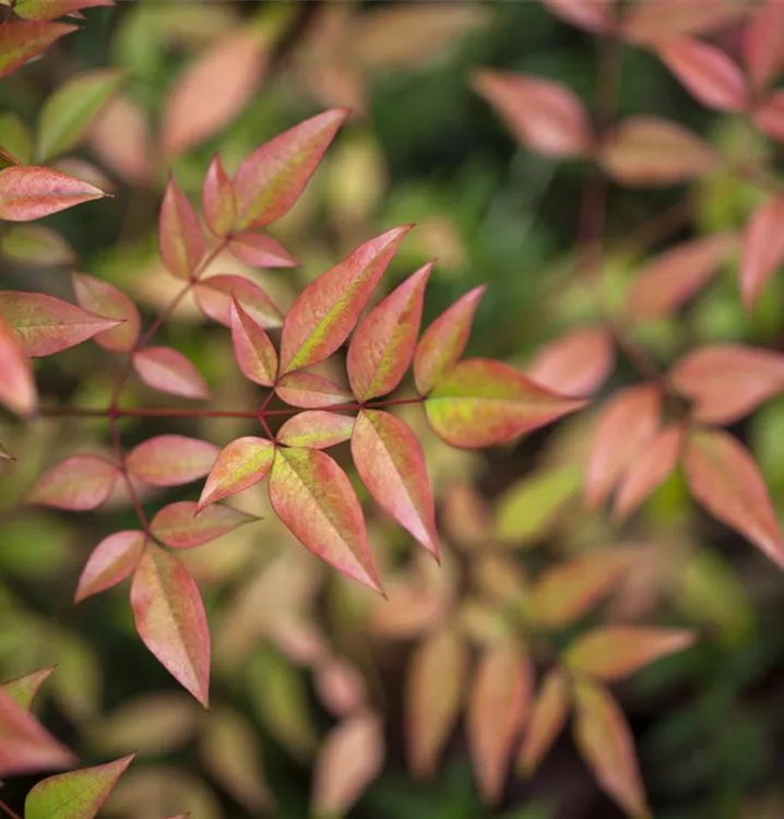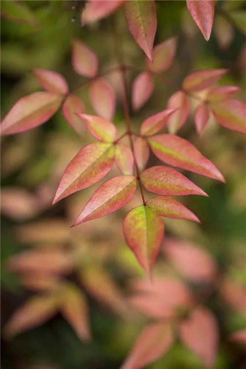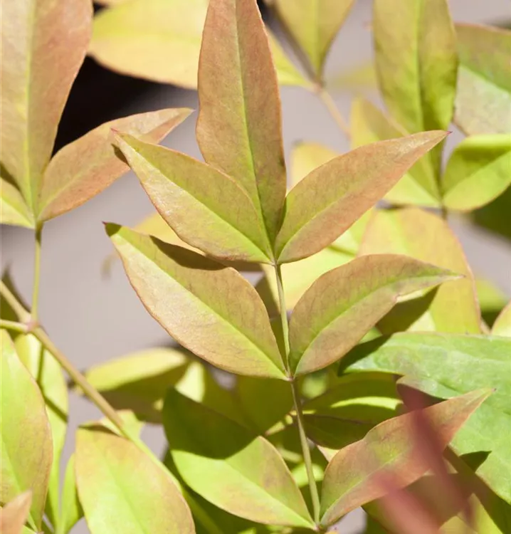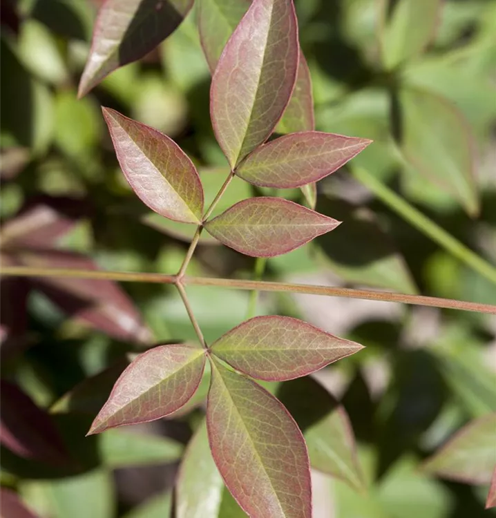 Die immergrünen Blätter des Heiligen Bambus sind grün-rot, lanzettlich. Heiliger Bambus zeigt sich leuchtend purpurrot im Herbst.
