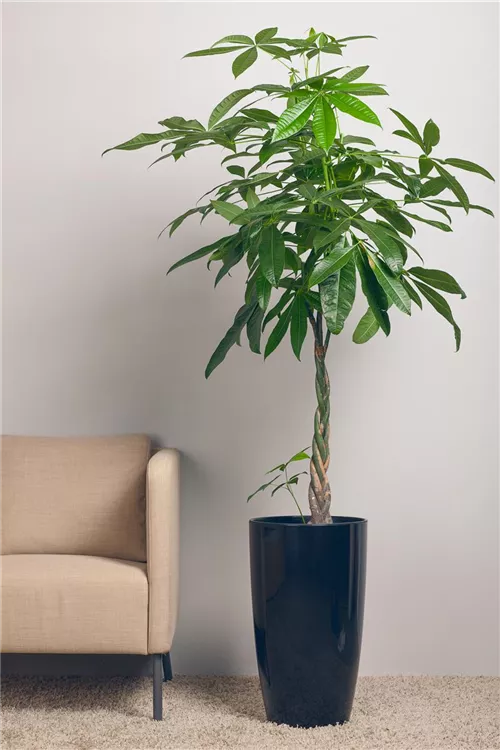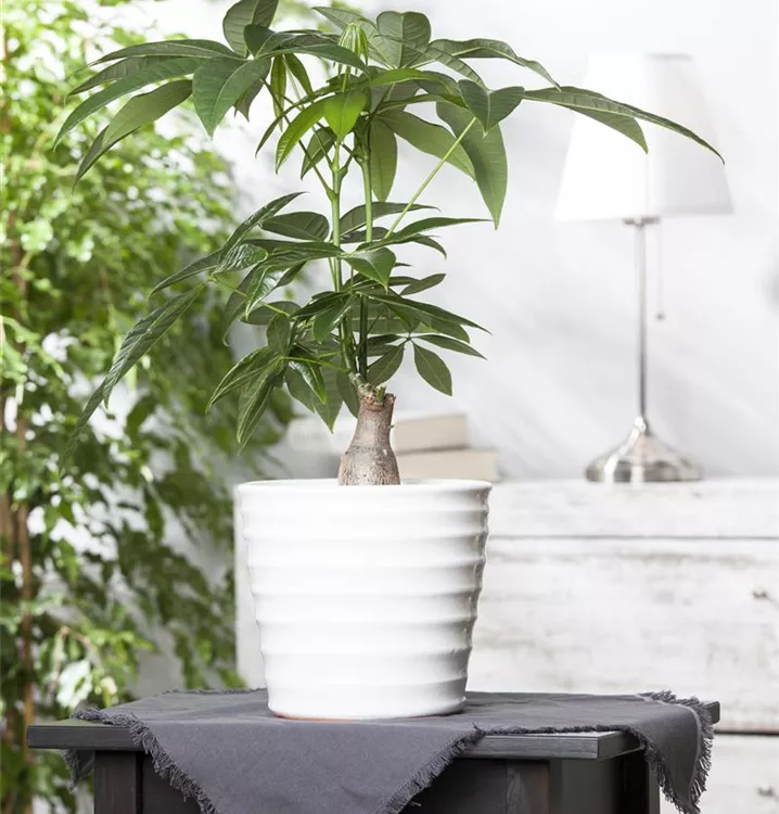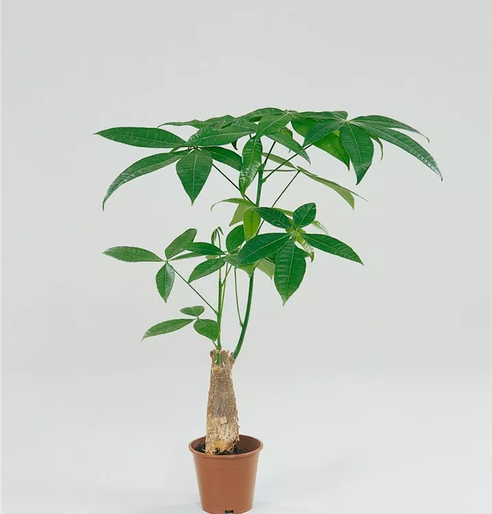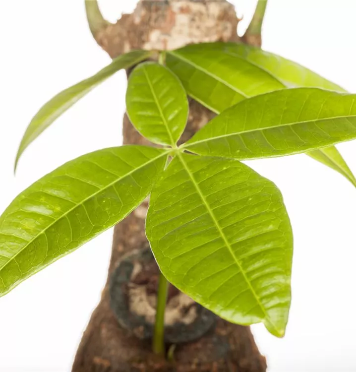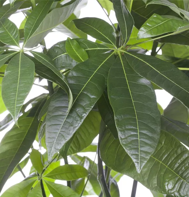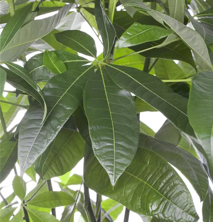 Die Glückskastanie (Pachira aquatica) trägt dunkelgrüne, handförmige, glänzende Blätter. Diese aufrechte Pflanze gedeiht am besten an einem sonnigen Standort.