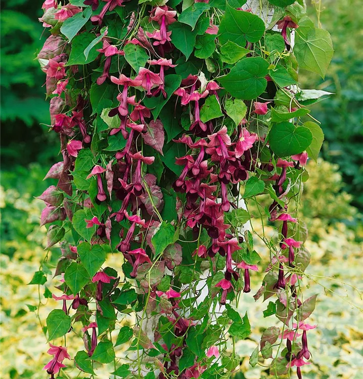 Rhodochiton atrosanguineum bildet während der gesamten Saison zahlreiche purpurrote Blüten.
