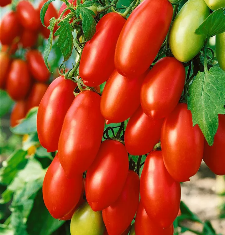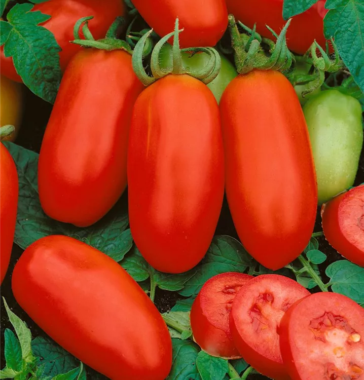 Die Tomate 'San Marzano' (Solanum lycopersicum) bildet mittelgroße Früchte, die aromatisch, fruchtig schmecken und bereits ab Juli geerntet werden können. Für das optimale Wachstum der Tomate 'San Marzano' werden ein sonniger Standort und durchlässiger, nährstoffreicher Boden benötigt.