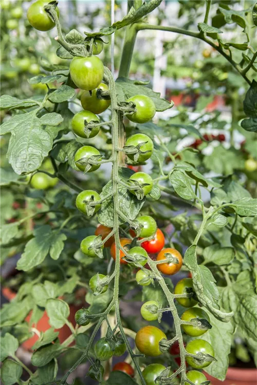 Die Tomate (Solanum lycopersicum) bildet Früchte, die aromatisch schmecken und bereits ab Juli geerntet werden können. Für das optimale Wachstum der Tomate werden ein sonniger Standort und durchlässiger, nährstoffreicher Boden benötigt.
