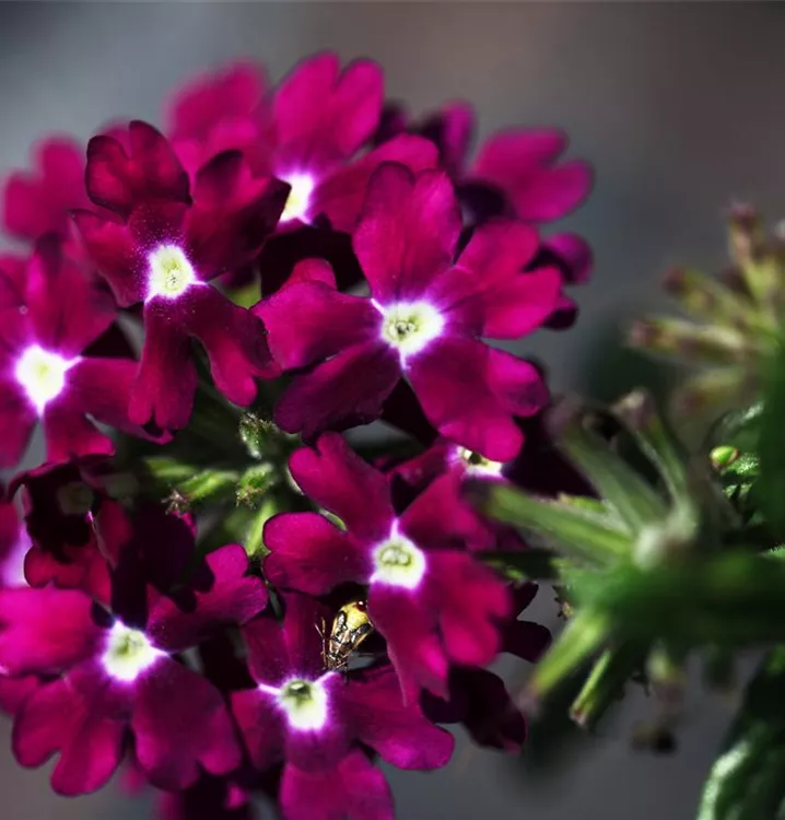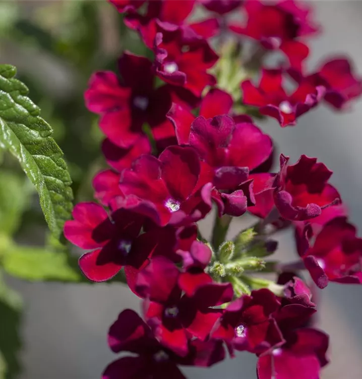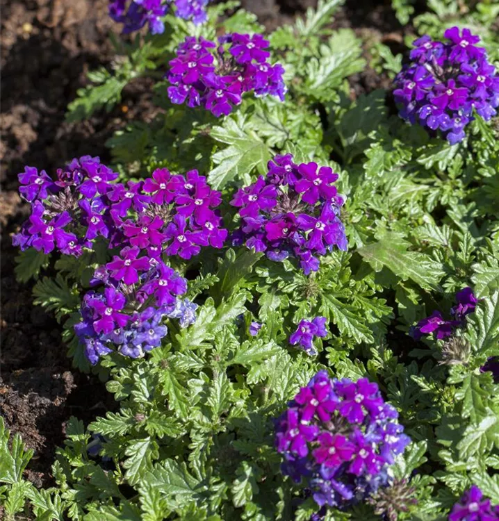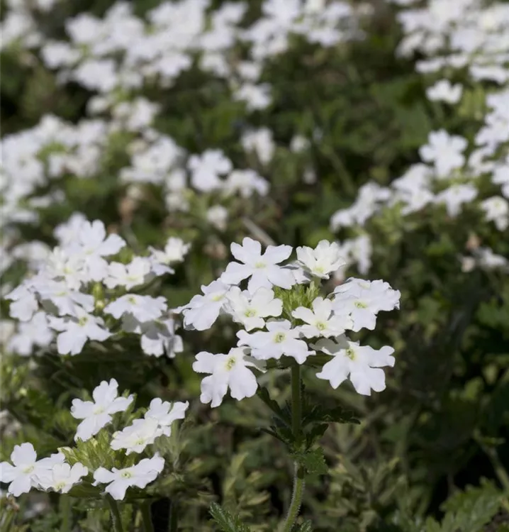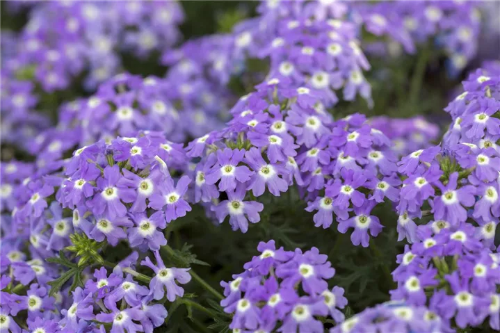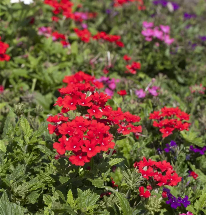 Die Verbena-Hybride (Verbena) ist eine beliebte Pflanze für den Balkon. Die unzähligen Blüten erscheinen, je nach Sorte, in verschiedenen Farben die ganze Saison hindurch. Ein sonniger Standort und ein durchlässiges Substrat werden bevorzugt.