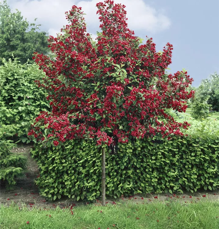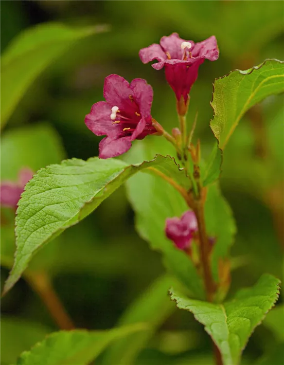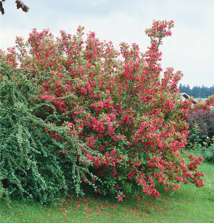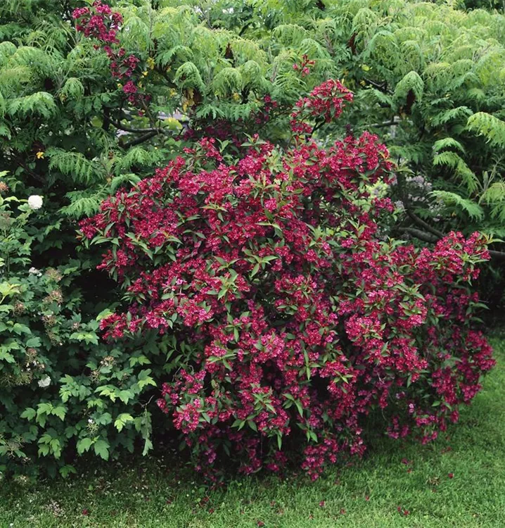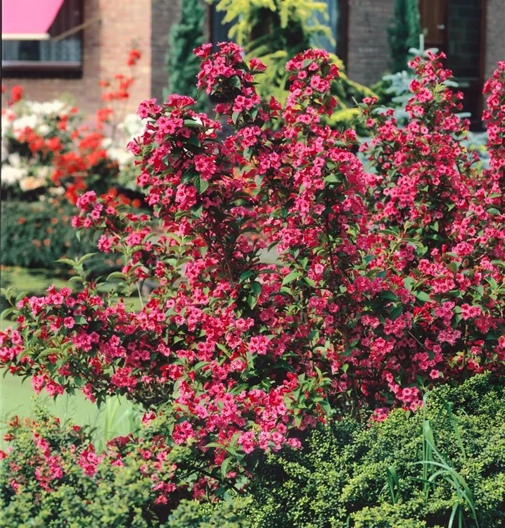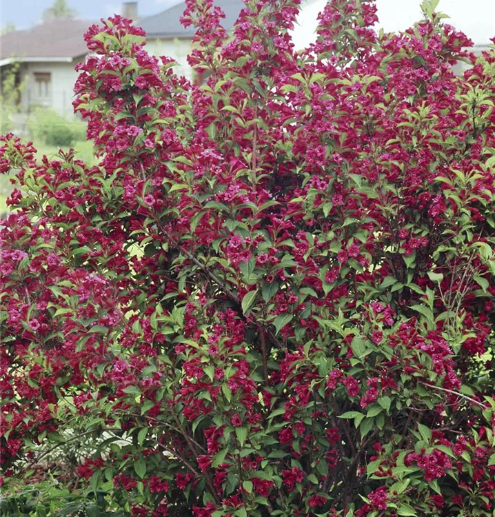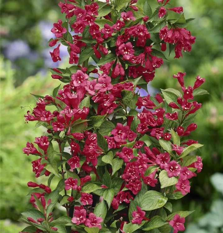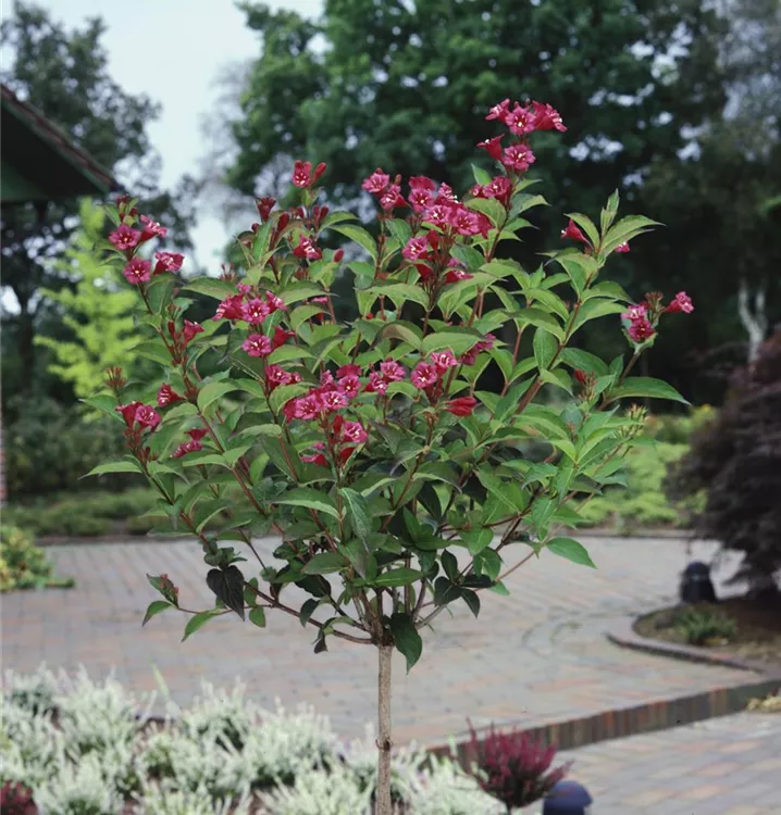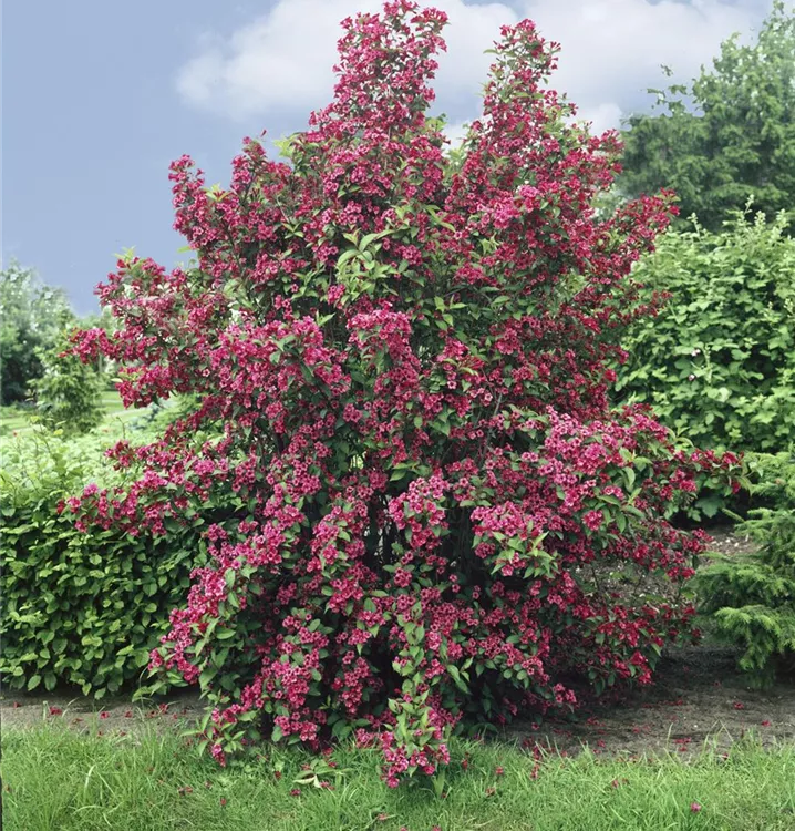 Die Weigelie 'Bristol Ruby'<sup>®</sup> (Weigela) ein buschiger, dichter Strauch, der, je nach Sorte, trichterförmige Blüten in verschiedenen Farben hervorbringt. An einem sonnigen bis halbschattigen Standort mit durchlässigem, nährstoffreichem Boden erreicht sie gewöhnlich eine Höhe von ca. 3 m und wird ca. 3,5 m breit.