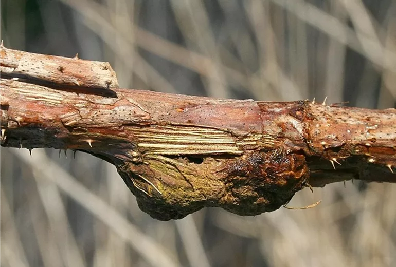 Befallene Triebe, die an den typischen Gallen zu erkennen sind, sollten rechtzeitig entfernt werden.