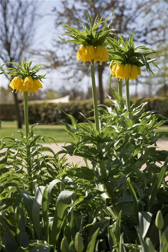 Schon seit dem ausgehenden 16. Jahrhundert wird die Zwiebelpflanze mit der auffälligen Kronenblüte in Mitteleuropa kultiviert. Bei der Kaiserkrone sitzen 3 bis 8 Blüten in einem so genannten Scheinquirl oder auch Verticillaster zusammen. So nennt man zusammengesetzte Blütenstände, die einander gegenüberstehen und sich berühren. Die roten, gelben oder orangefarbenen Glockenblüten werden von einem Blattschopf gekrönt, dessen Blätter spitz in die Höhe ragen. Kaiserkronen haben einen intensiven Duft, der nicht jedem gefällt. Dafür wird ihnen nachgesagt, sie seien ein Wühlmausschreck. Ein Segen für jeden Garten! Die Wuchshöhe von Kaiserkronen beträgt 80 bis 120 Zentimeter. Damit überragen sie viele Gartenblumen und -sträucher und werden zum Blickfang. Ihre Hauptblütezeit ist zwischen April und Mai.