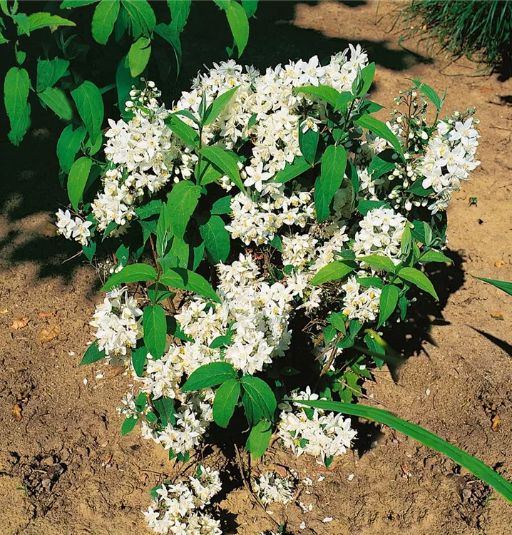 Deutzia magnifica ist ein Herzwurzler und bildet, je nach Boden, oberflächennahe Wurzeln.