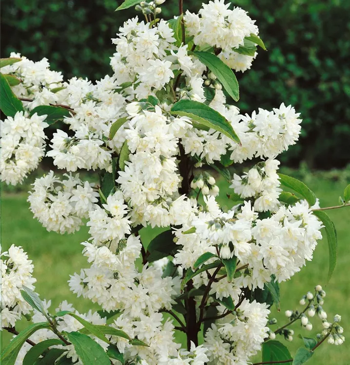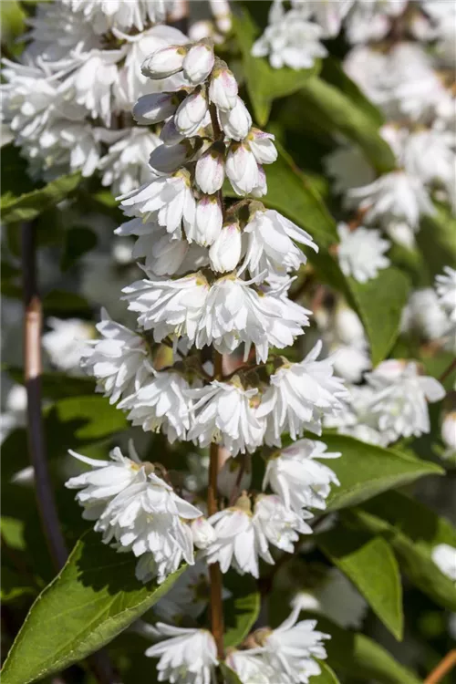 Die weißen, gefüllten, glockenförmigen Blüten des Hohen Sternchenstrauch erscheinen in Rispen im Juni. Diese werden etwa 2 - 3 cm groß.