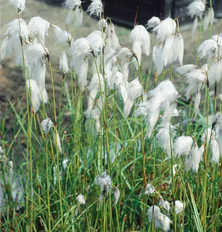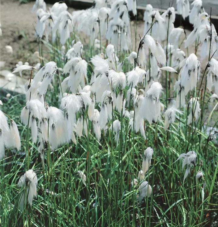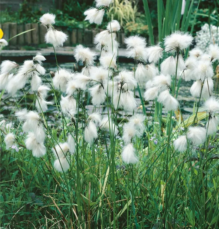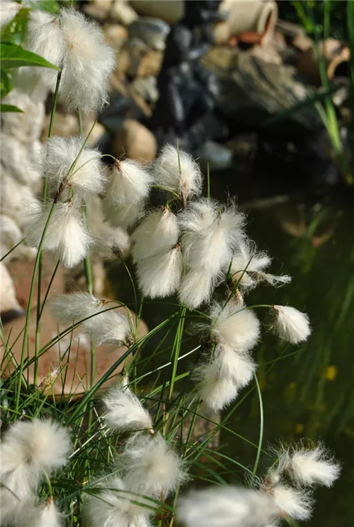 Das Schmalblättrige Wollgras (Eriophorum angustifolium) ist mit seinen mittelgrünen Blättern eine ausgesprochen dekorative Wasserpflanze, die für solche Einsatzbereiche wie Teichrand und Bachlauf besonders gut geeignet ist. Die Blüten erscheinen, je nach Sorte, in vielen Farben von April bis Mai. Es bevorzugt durchlässigen, humosen, kalkfreien, feuchten bis nassen Boden in sonniger bis halbschattiger Lage. Das Schmalblättrige Wollgras ist gut frostverträglich. Die aufrechte, ausläuferbildende Staude erreicht gewöhnlich eine Höhe von ca. 40 cm.