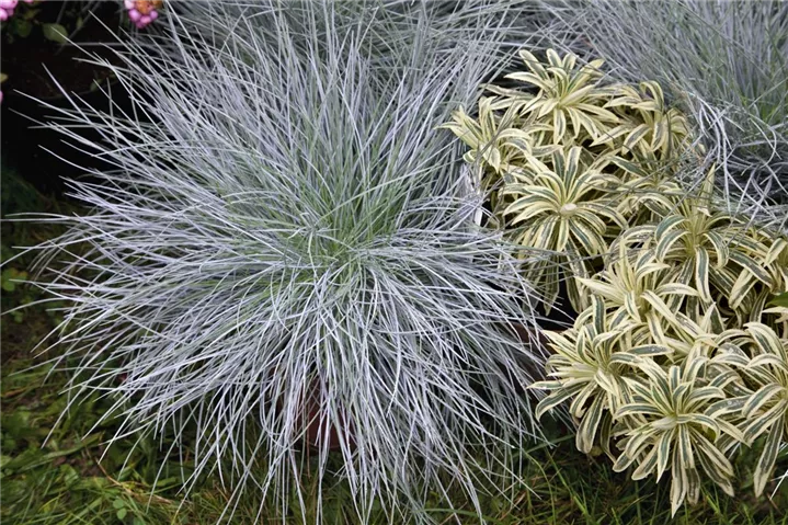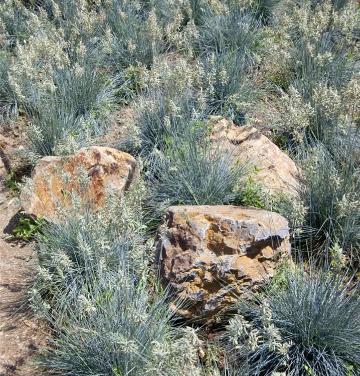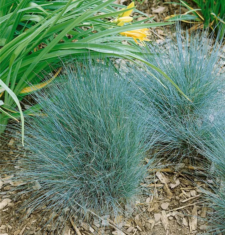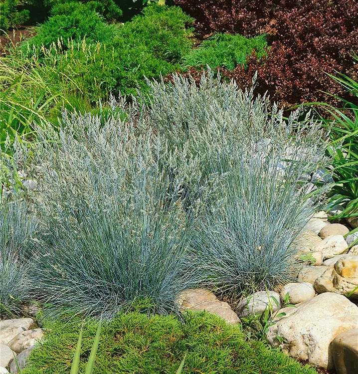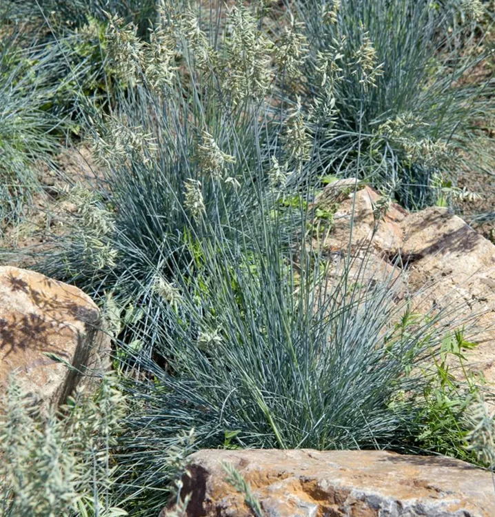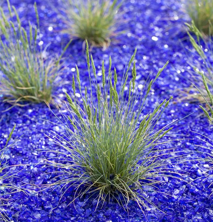 Der Blau-Schwingel (Festuca glauca) ist mit seiner blau-grünen Blattfärbung ein dekoratives Gestaltungselement im Garten, welches sich an einem sonnigen Standort mit einem möglichst durchlässigen, sandigen, lehmigen Boden am wohlsten fühlt. Die braunen Blütenwedel schmücken die polsterbildend wachsende Pflanze ab Sommer. Bei günstigen Bedingungen erreicht dieses winterharte Gras eine Höhe von ca. 30 cm und wird bis zu 60 cm breit.