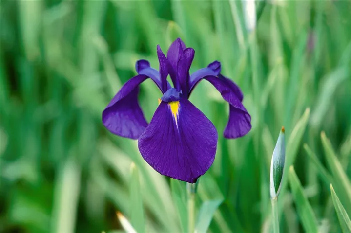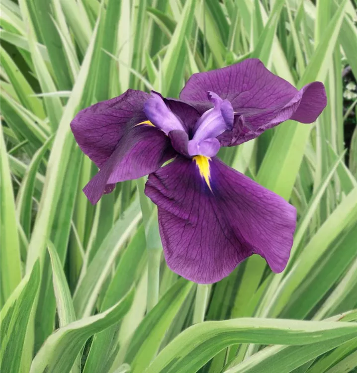Iris ensata 'Variegata' bildet violette Blüten ab Juni.