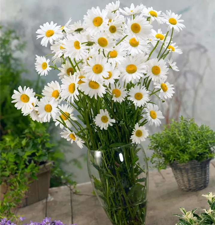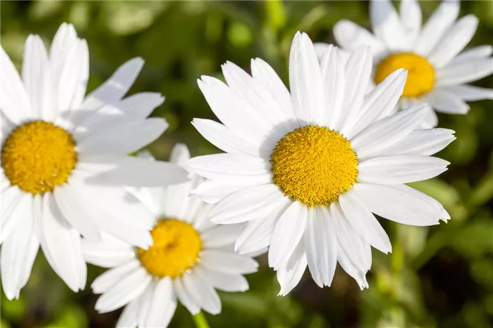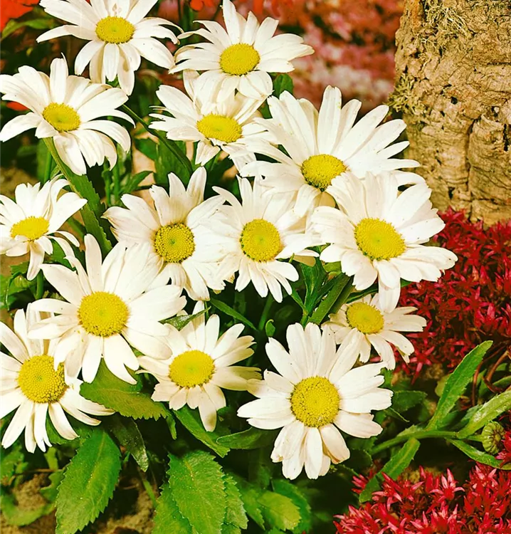 Die Kleine Margerite (Leucanthemum vulgare) ist eine aufrechte Staude, die von Juli bis September weiße, körbchenartige Blüten bildet. An einem sonnigen bis halbschattigen Standort mit durchlässigem Boden erreicht sie gewöhnlich eine Höhe von ca. 40 cm und wird ca. 40 cm breit. Die Kleine Margerite ist gut frostverträglich.