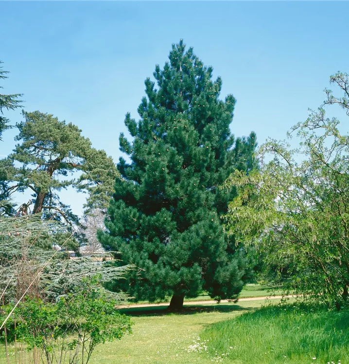 Die Schwarzkiefer (Pinus nigra) ist ein Gehölz, welches kegelförmig wächst und gewöhnlich eine Höhe von ca. 25 m und eine Breite von ca. 10 m erreicht. Ihre nadelförmigen Blätter haben eine dunkelgrüne Färbung. Dekorative braune Zapfen zieren Pinus nigra ab September. Dieses Gehölz ist gut frostverträglich. Sie bevorzugt durchlässigen, kalkhaltigen, sandigen Boden in sonniger Lage.