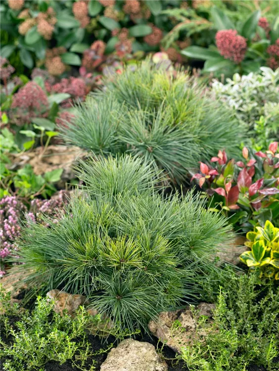 Weymouth-Kiefer 'Green Twins' ist ein kegelförmig wachsender, malerischer Großbaum mit lockerer Krone. Sie erreicht gewöhnlich eine Höhe von 0,8 - 1 m und wird ca. 60 - 80 cm breit.
