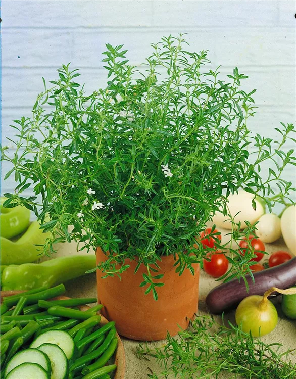 Das Sommer-Bohnenkraut, Stamm (Satureja hortensis) ist eine Kräuterpflanze mit einem würzigen Geschmack. Seine dunkelgrünen Blätter sind lanzettlich. Für das optimale Wachstum des Sommer-Bohnenkraut, Stamms werden ein sonniger Standort und durchlässiger, nährstoffreicher Boden benötigt.