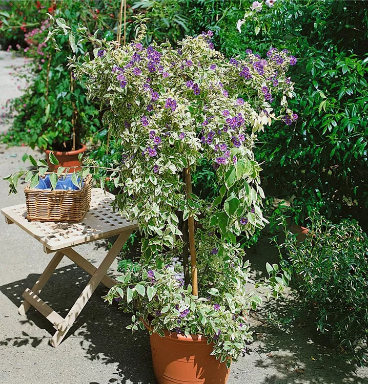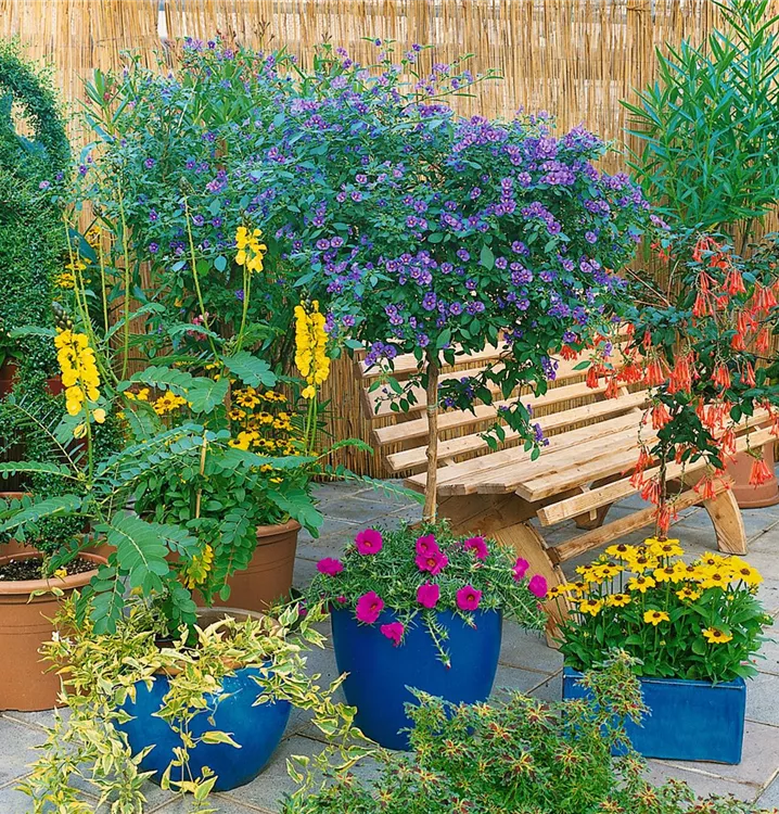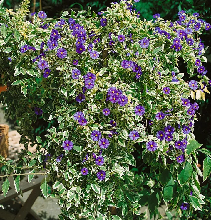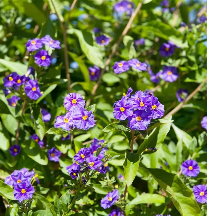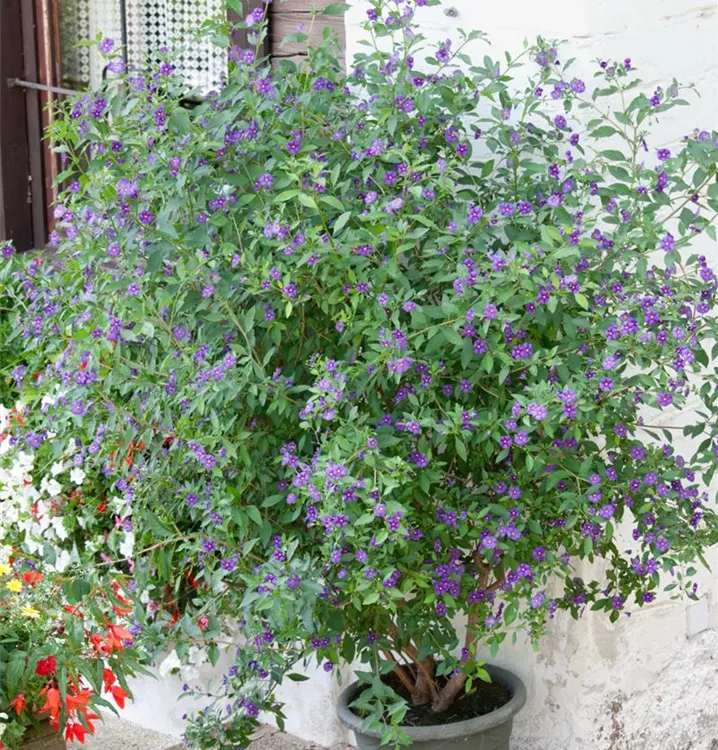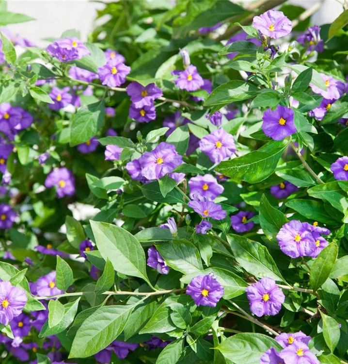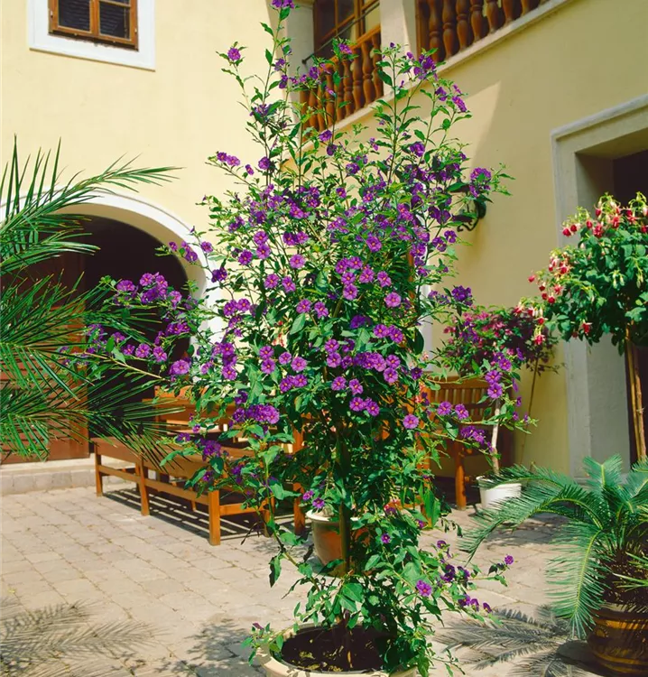 Der Enzianstrauch (Solanum rantonnetii) ist eine sehr beliebte Kübelpflanze. Seine dekorativen Blüten sind sternförmig und erscheinen von Mai bis Oktober. Verwenden Sie bevorzugt die spezielle Kübelpflanzenerde, denn sie verdichtet sich über längere Zeit nicht.