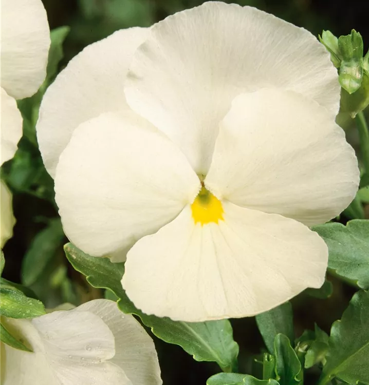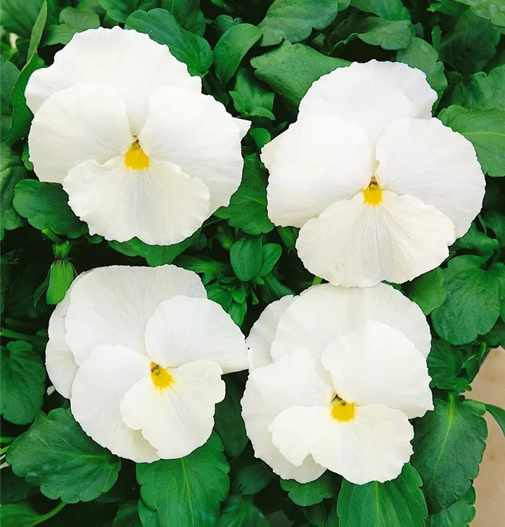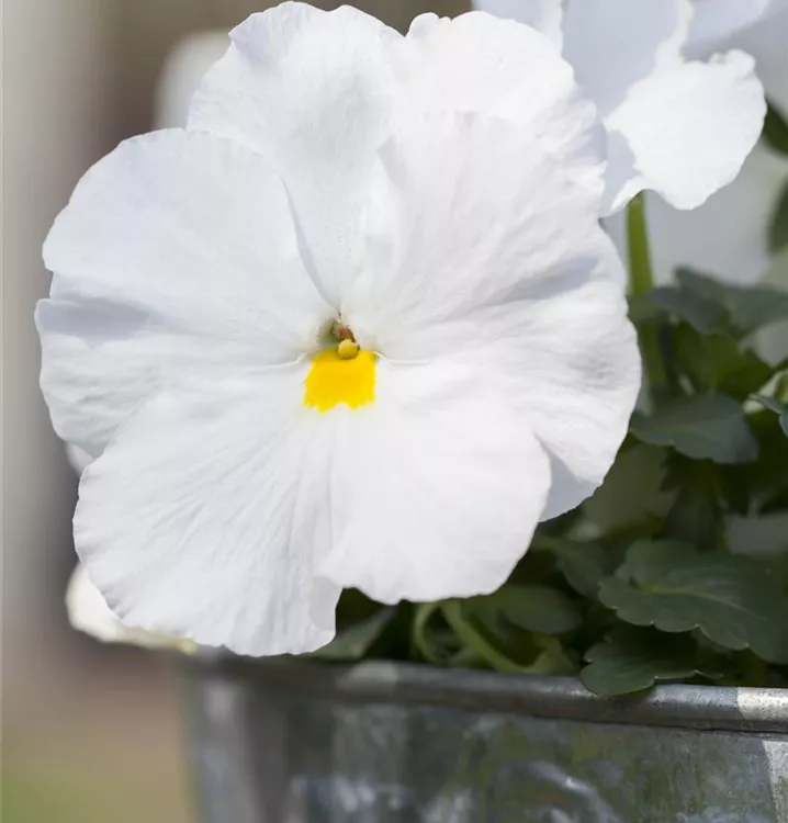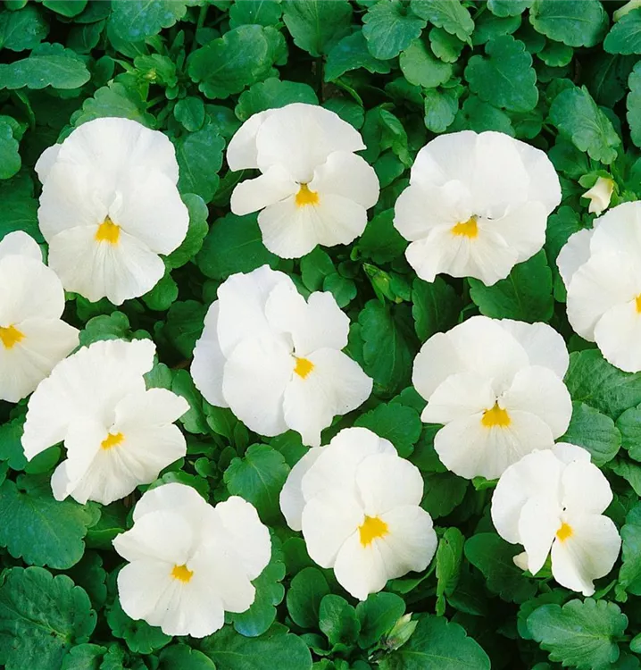 Das Garten-Stiefmütterchen, weiß (Viola x wittrockiana) ist eine beliebte Pflanze für den Balkon, die während der gesamten Saison unzählige weiße Blüten bildet. Ein halbschattiger bis schattiger Standort und ein durchlässiges Substrat werden bevorzugt.
